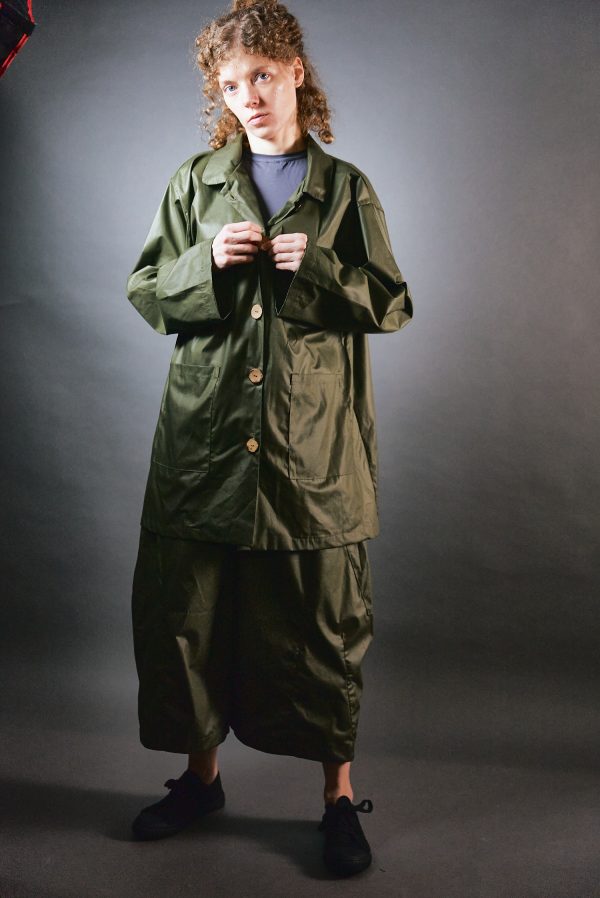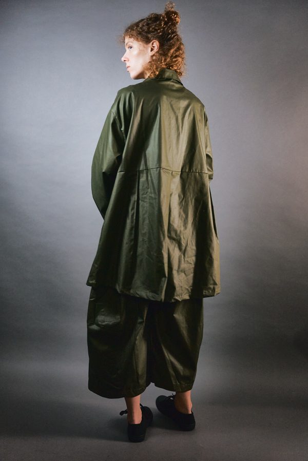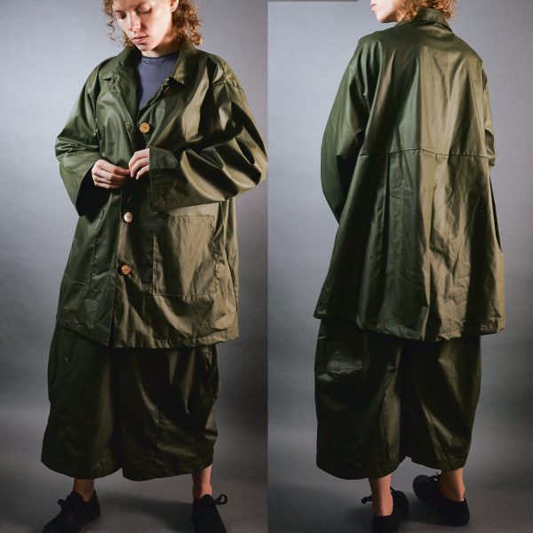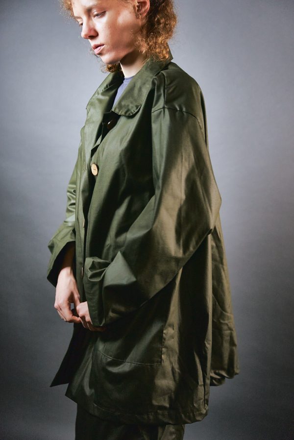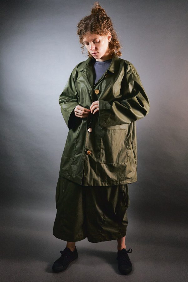 Odkryj ręcznie szyty, długi żakiet zielony z powlekanej bawełny.