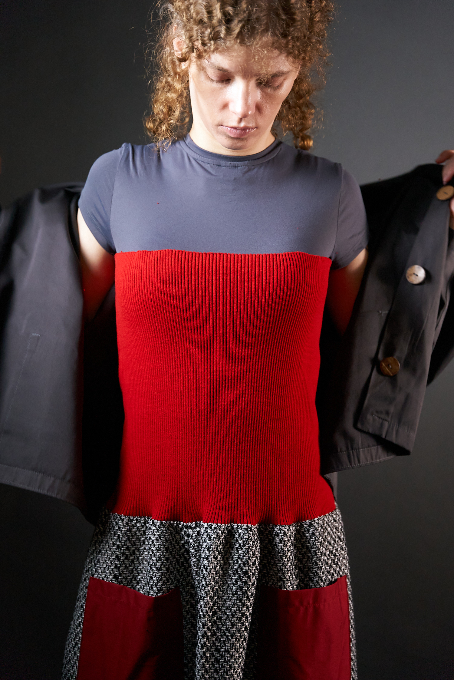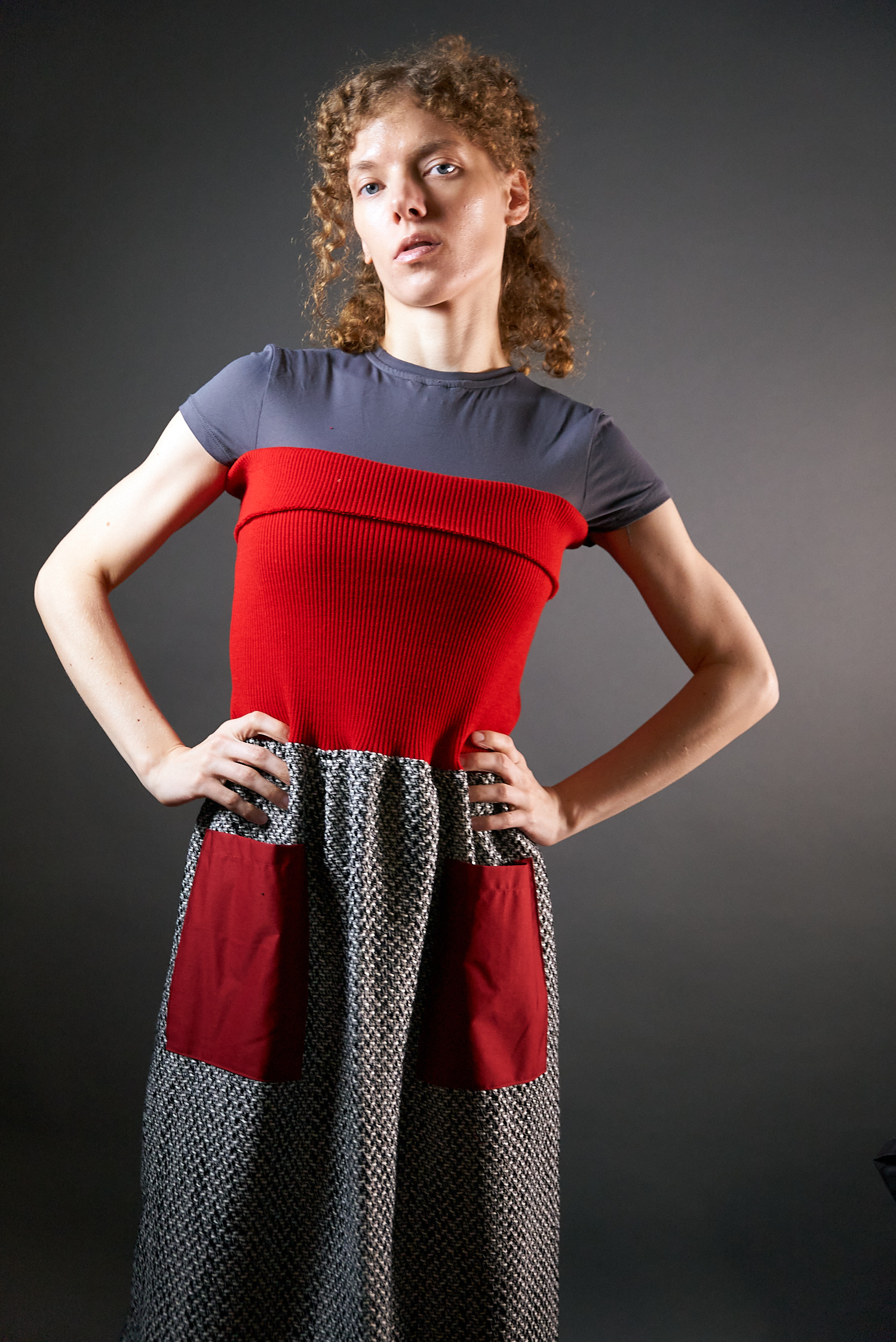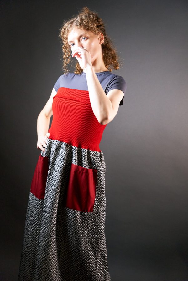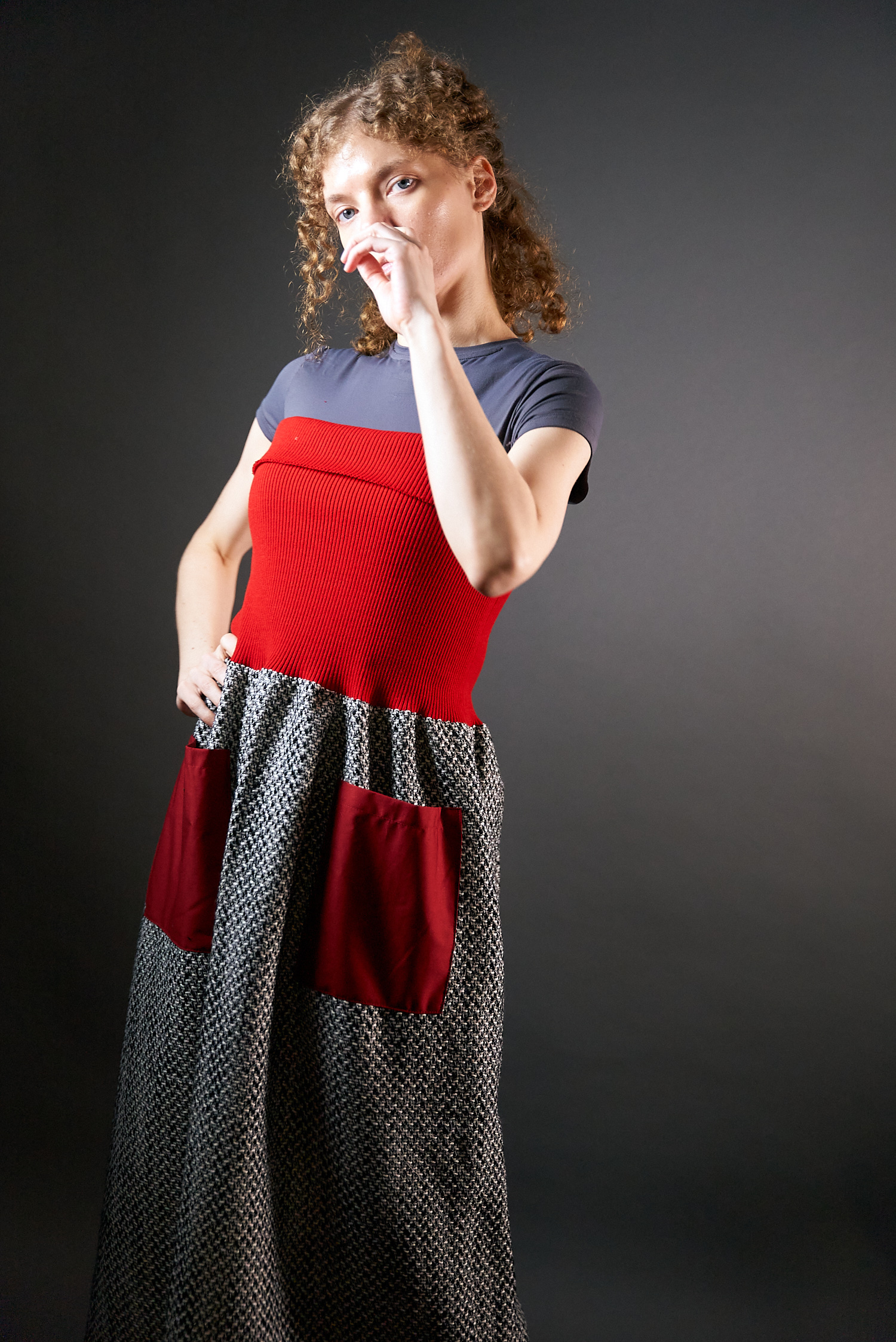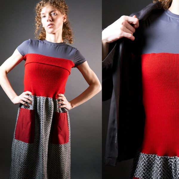 Spódnica -sukienka z długim czerwonym ściągaczem.