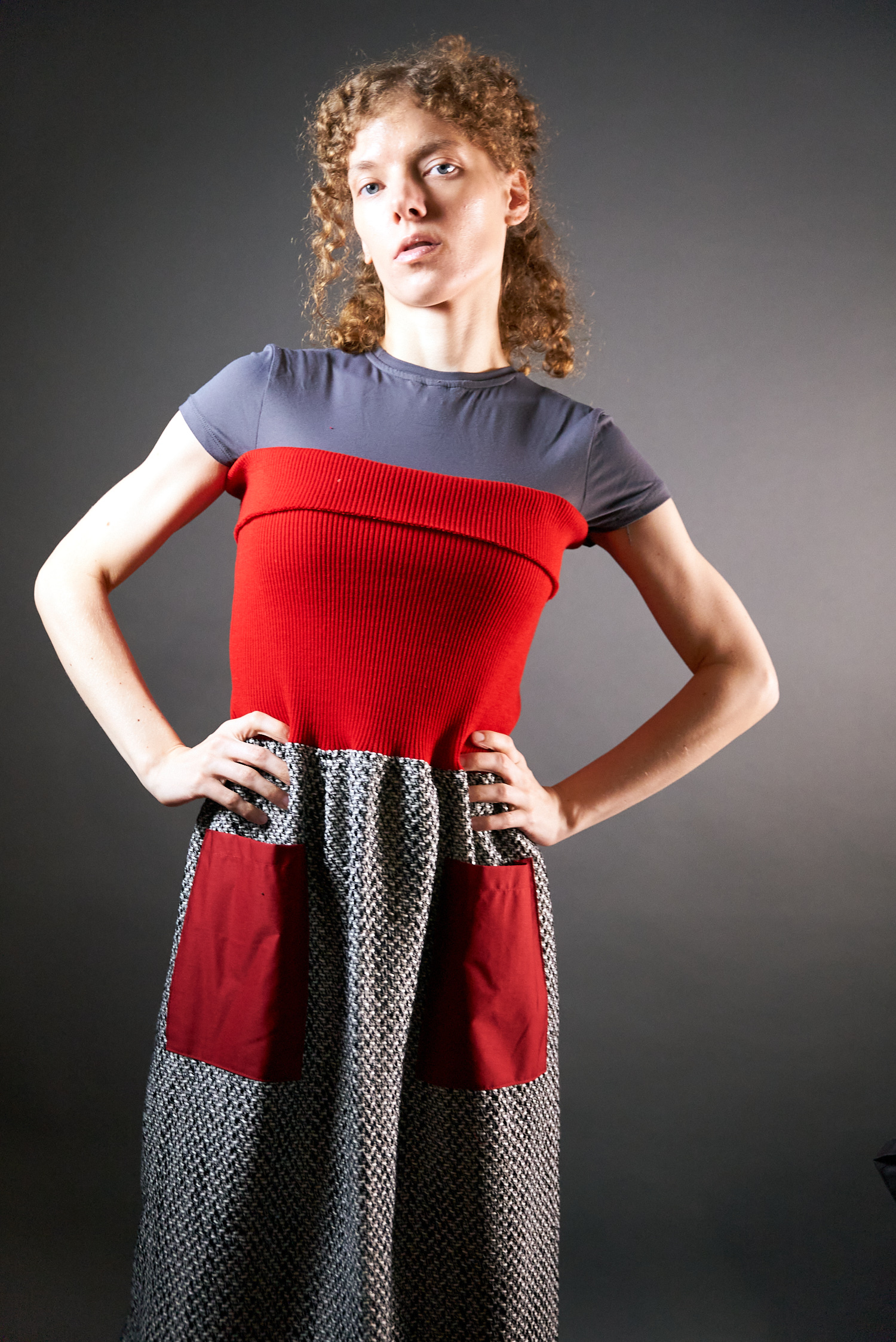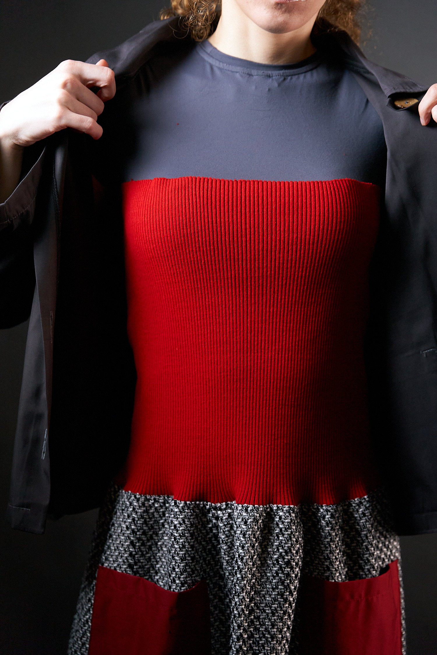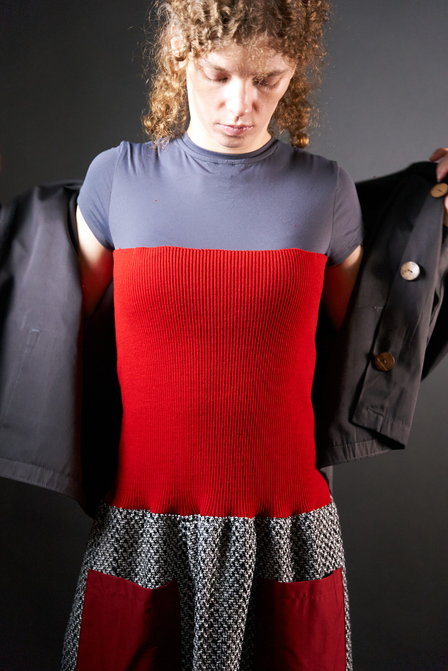 Spódnica -sukienka z długim czerwonym ściągaczem.