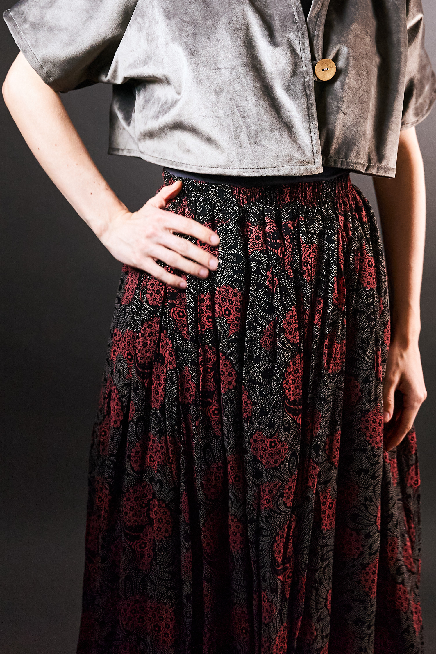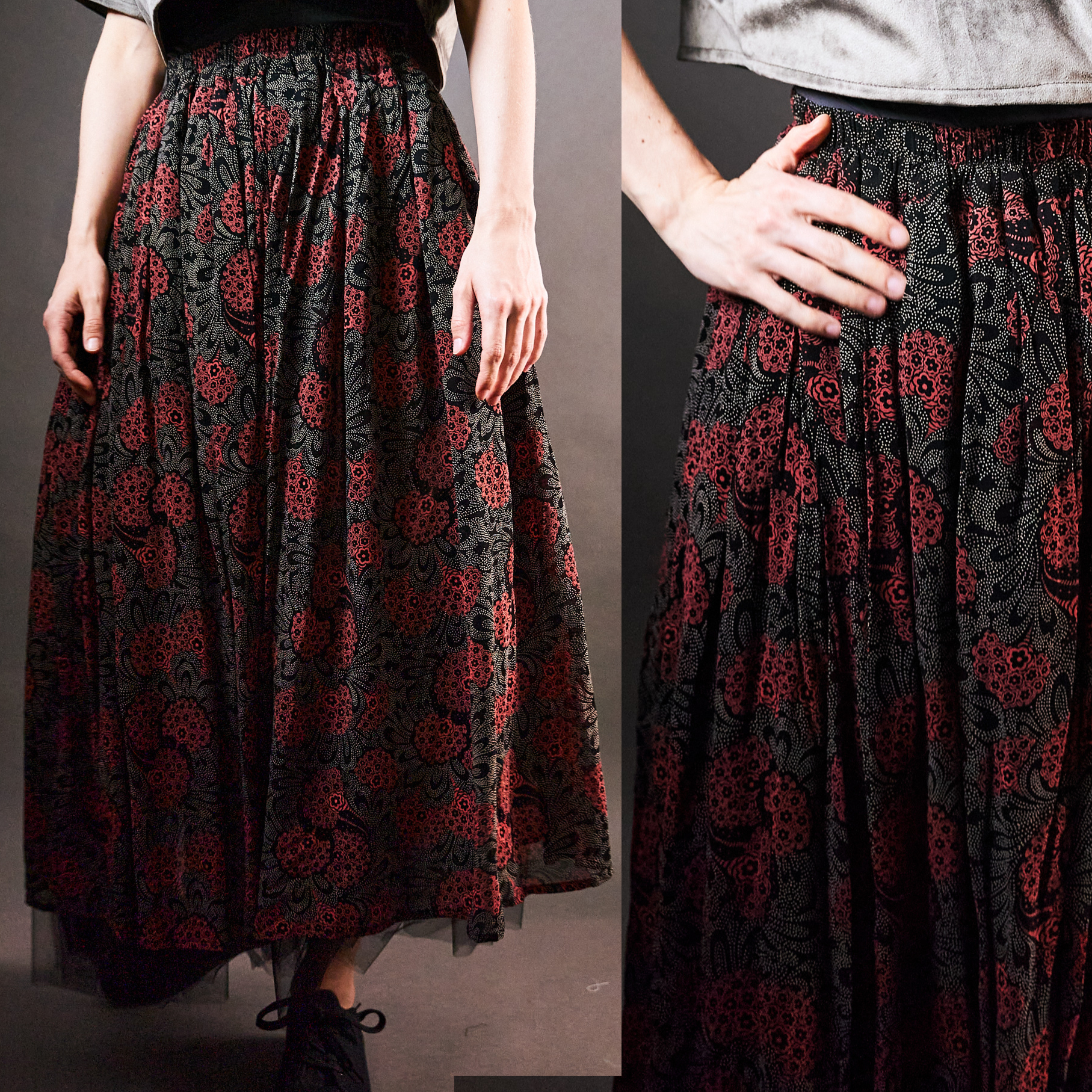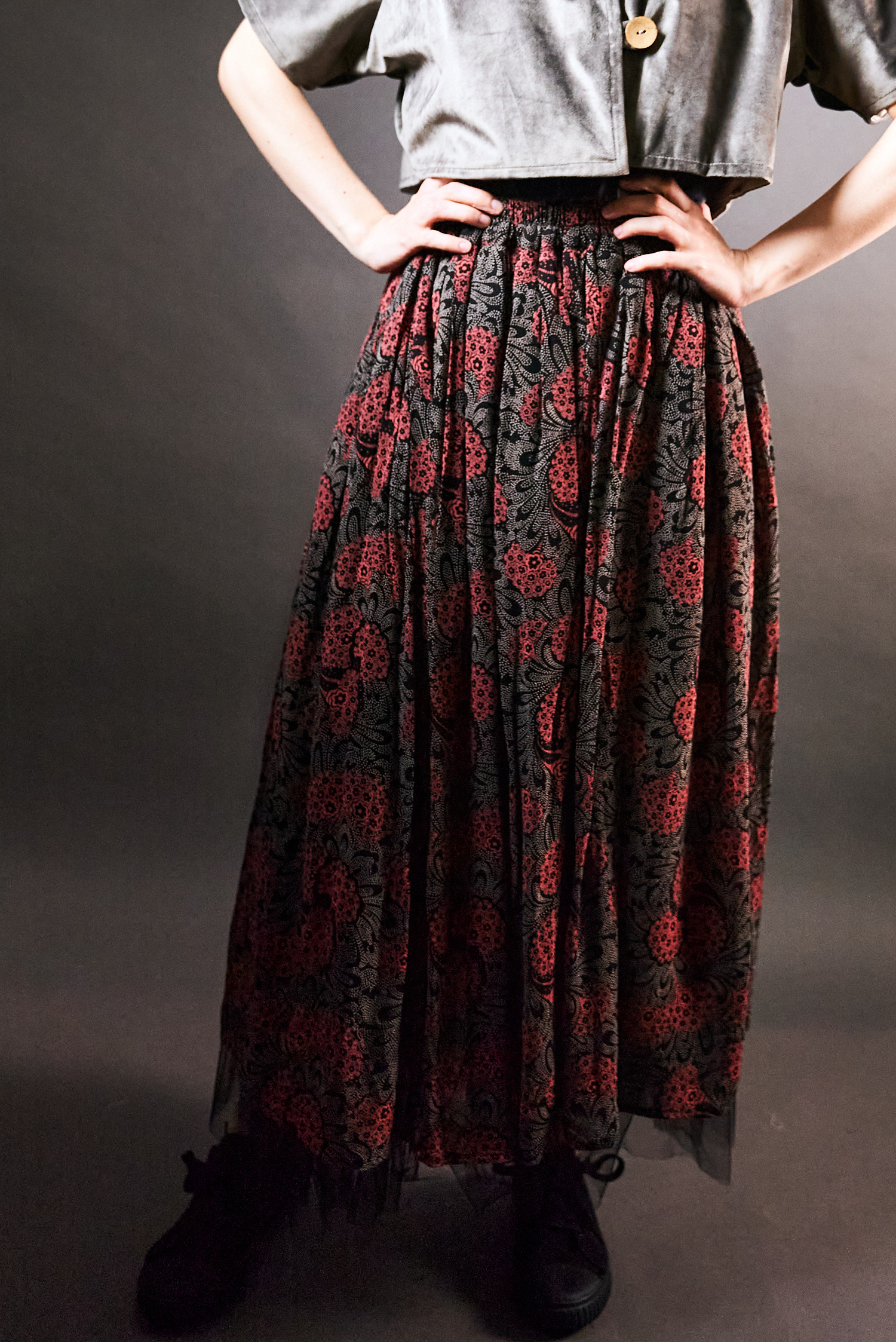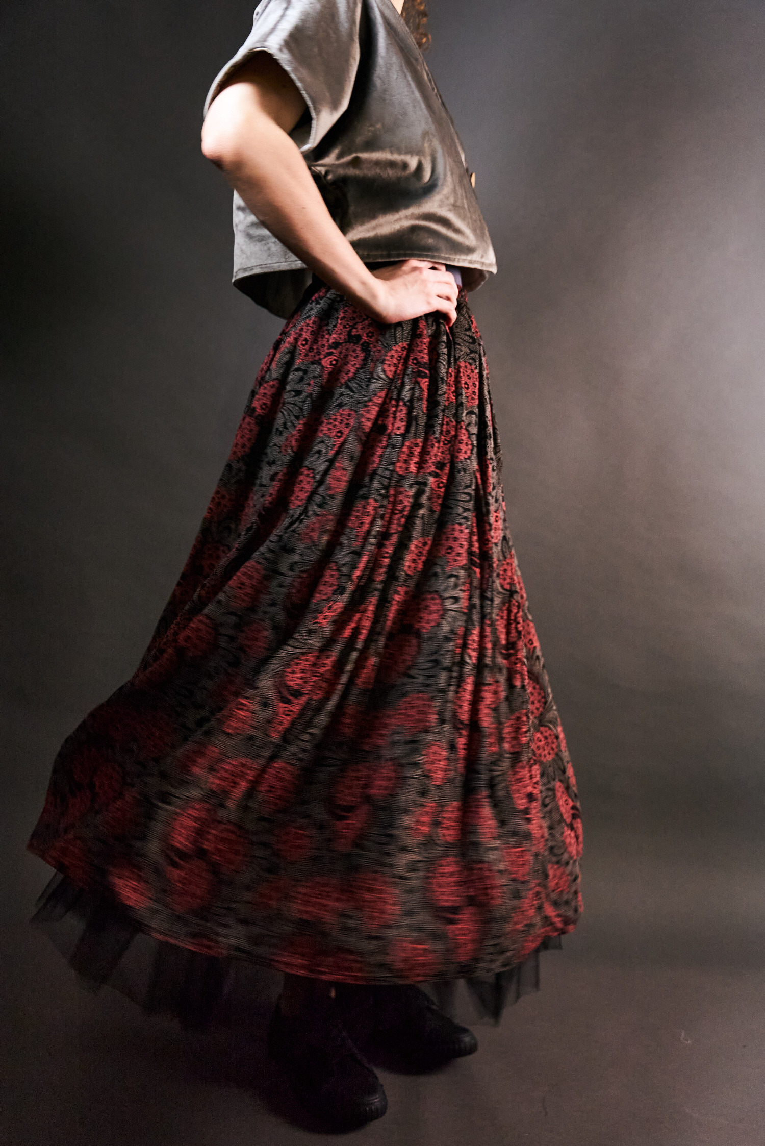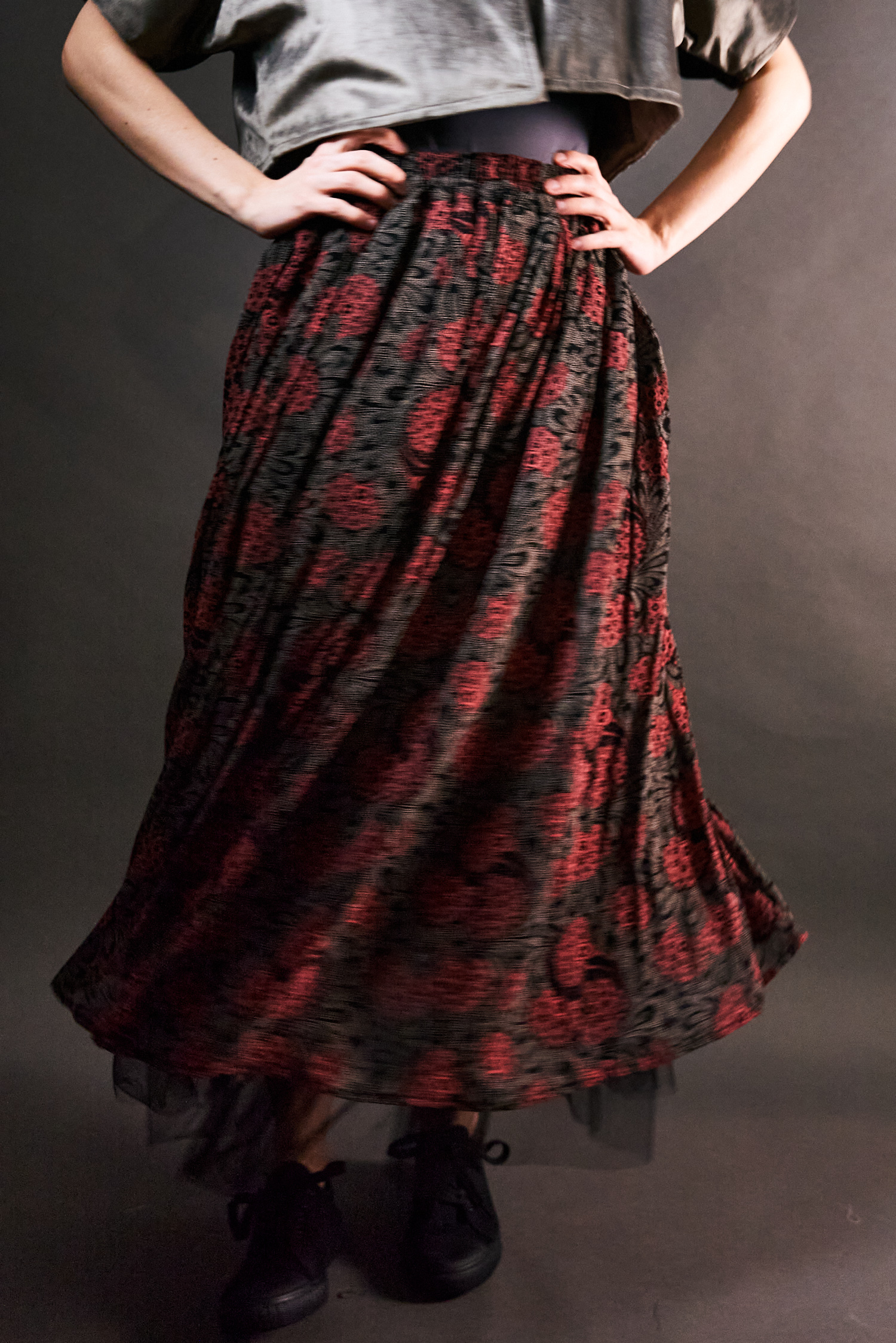 Wzorzysta spódnica z żorżety podbita czarnym tiulem